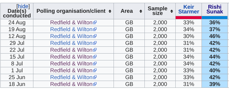 We have referred before to this polling series from newbie pollsters Redfield Wilson which asks those sampled to choose between Starmer and Sunak as “Best PM”.