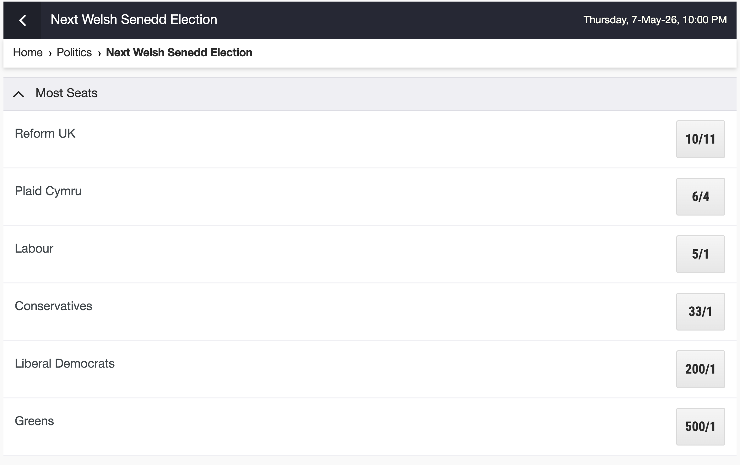 The polling currently indicates Reform are on course to win most seats but I think the value might be on Labour at 5/1 if there’s any swingback to the governing party, it might also be a good petri dish to see if there’s any tactical voting against Reform, although Plaid Cymru might also benefit from that too.