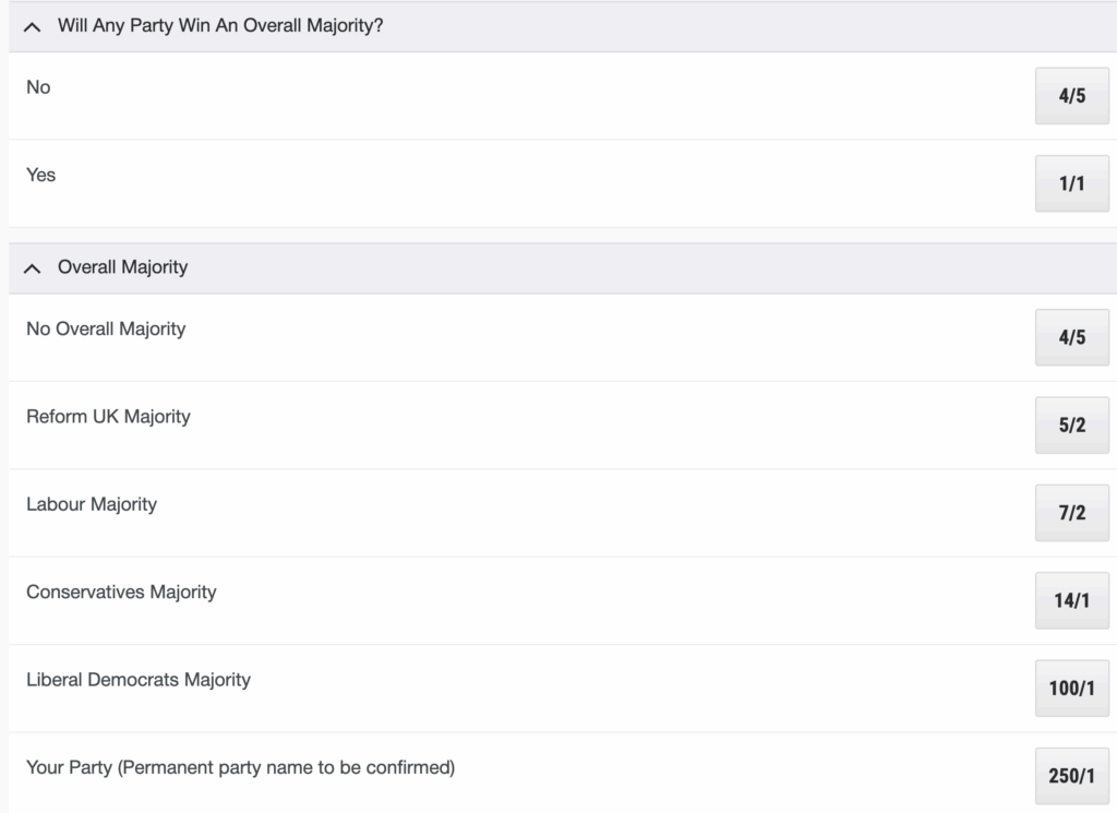Ladbrokes have a couple of majority related markets. When it comes to the first market on if any party will win a majority, this isn’t a market I am plan to play at the moment.
