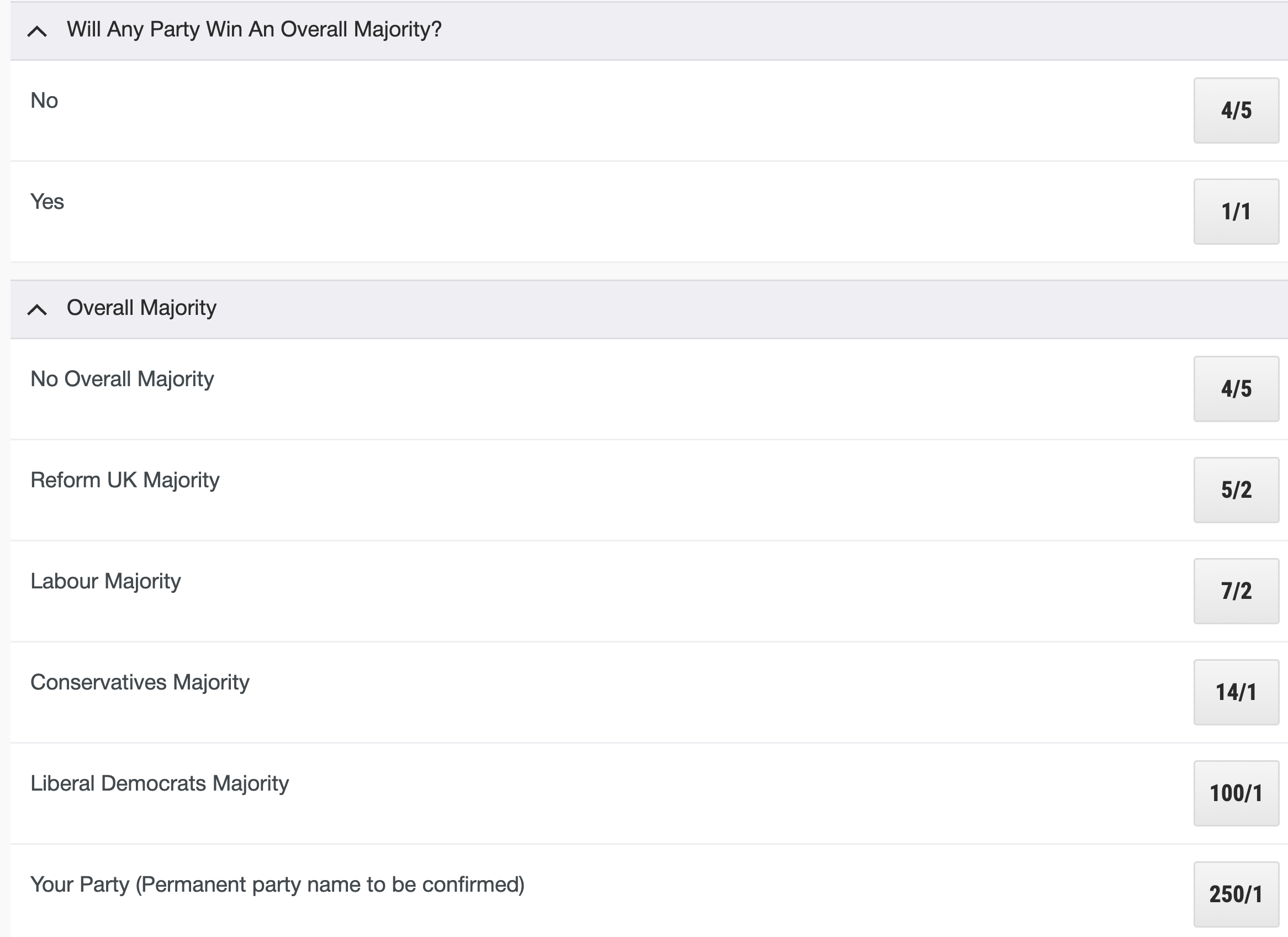 If Reform do implode (and Labour continue to range between dire and appalling governance) then you might want to put some money on a Tory majority at 14/1 or at 18/1 on Betfair but I wouldn’t put too much money on it.