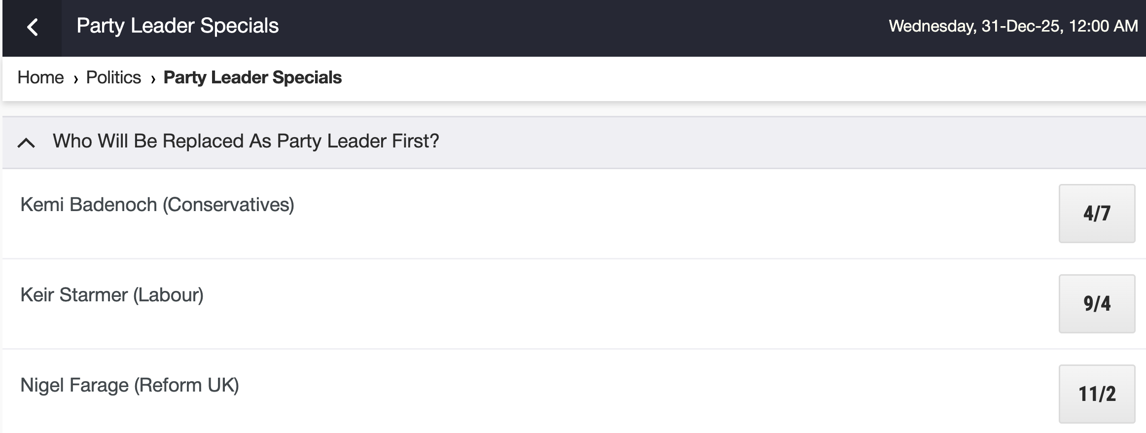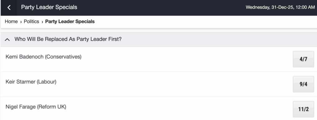 Last in, first out? Last in, first out? 26/8/2025 TSE Comments 0 Comment The odds in this betting market from Ladbrokes seem right to me. My expectation remains that after the next May’s elections as England, Scotland, and Wales unite to extirpate the Tories then Kemi Badenoch will be ousted. TSE