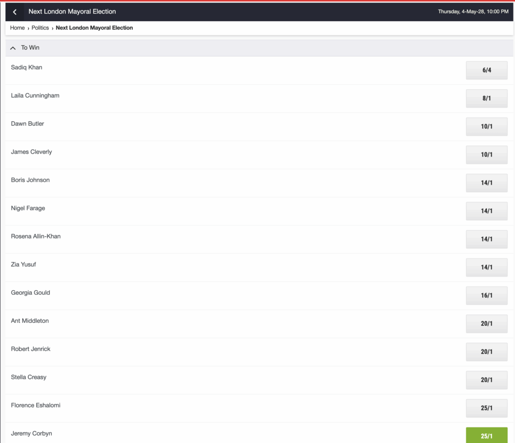 I can see Corbyn’s brand of politics appealing to London in 2028 so at 25/1 I feel a trading bet is in order but I understand why punters might want to swerve this bet.