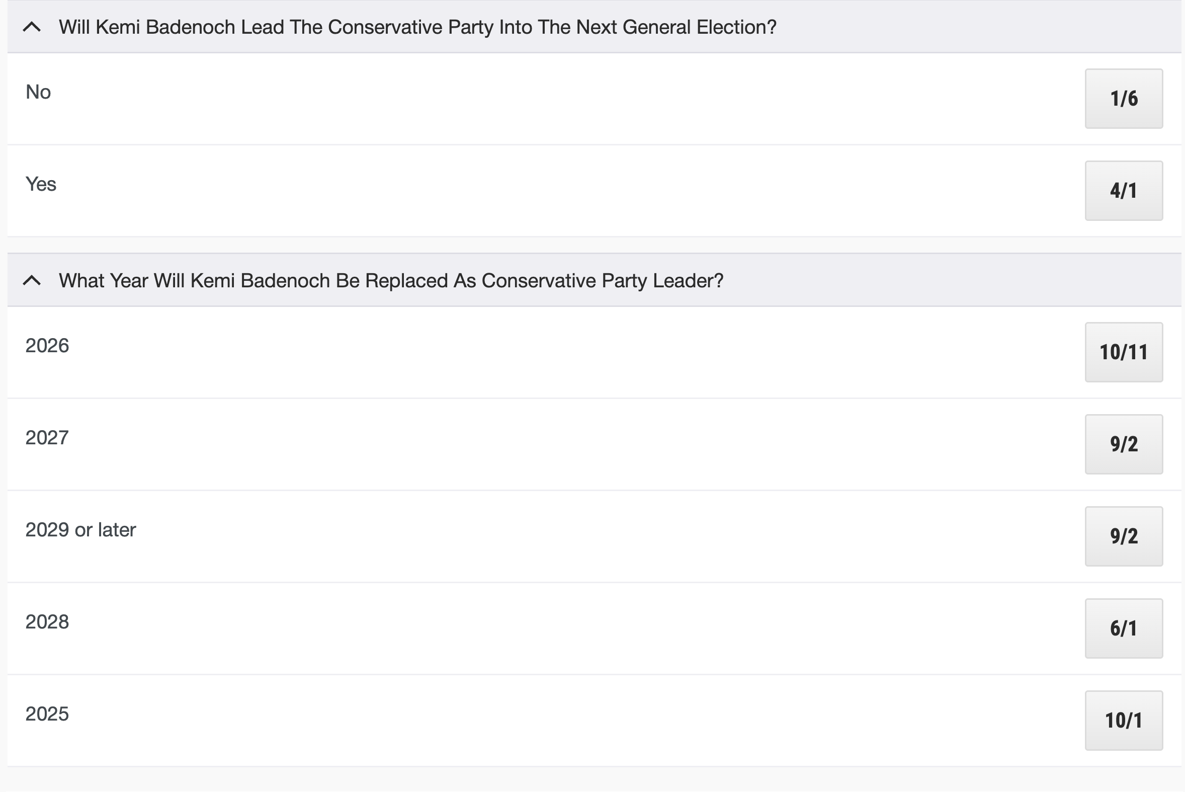 So rather than oust her this November, they will wait until next May, so I think the odds are right on Kemi Badenoch’s exit date.