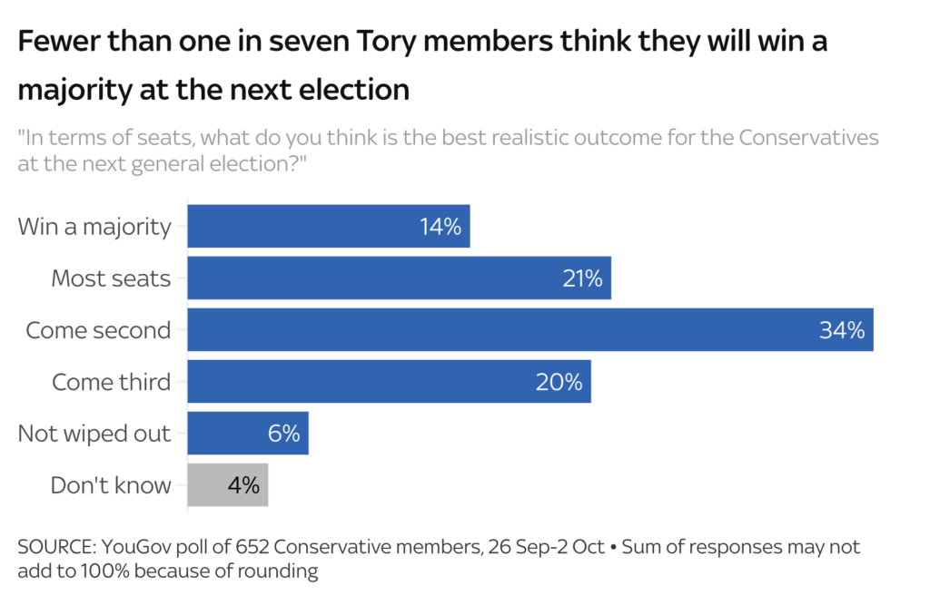 ‘Tory members are split as to whether she will make it that far. A total of 49% think she will be out before the election, compared with 47% who think she’ll still be in place.’