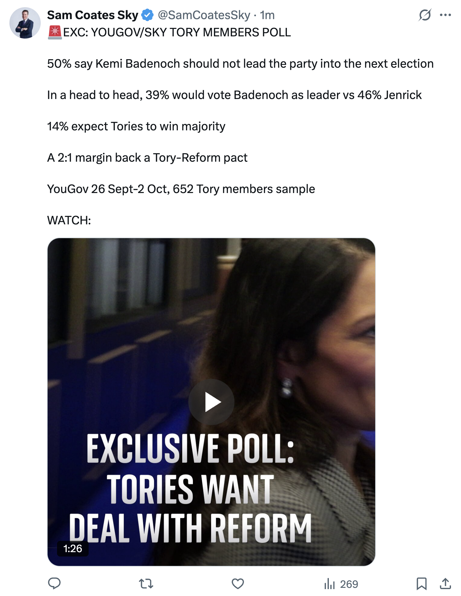 This polling doesn’t bring any good news for Kemi Badenoch, if the leadership election was run today Jenrick would win.