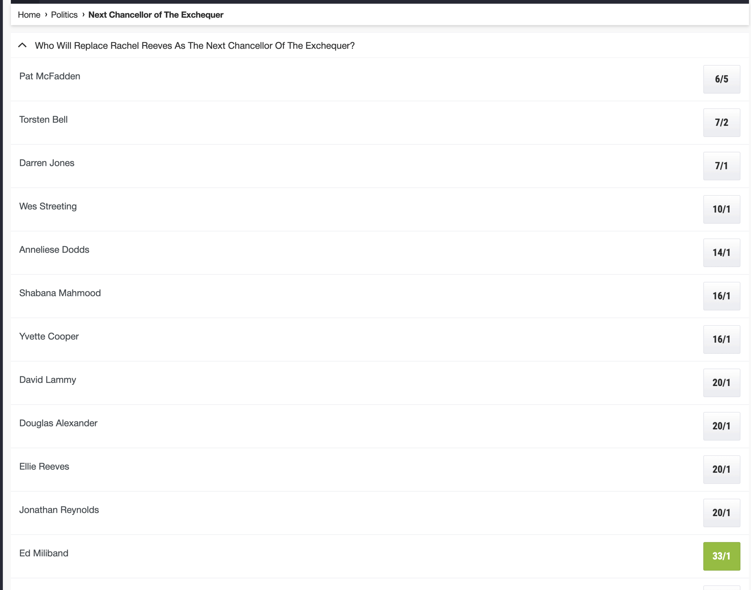 Say Ed Miliband endorses Wes Streeting in exchange for being appointed as Chancellor, I think that is lower than a 33/1 chance, so I’ve stuck some money on Ed Miliband as next Chancellor.