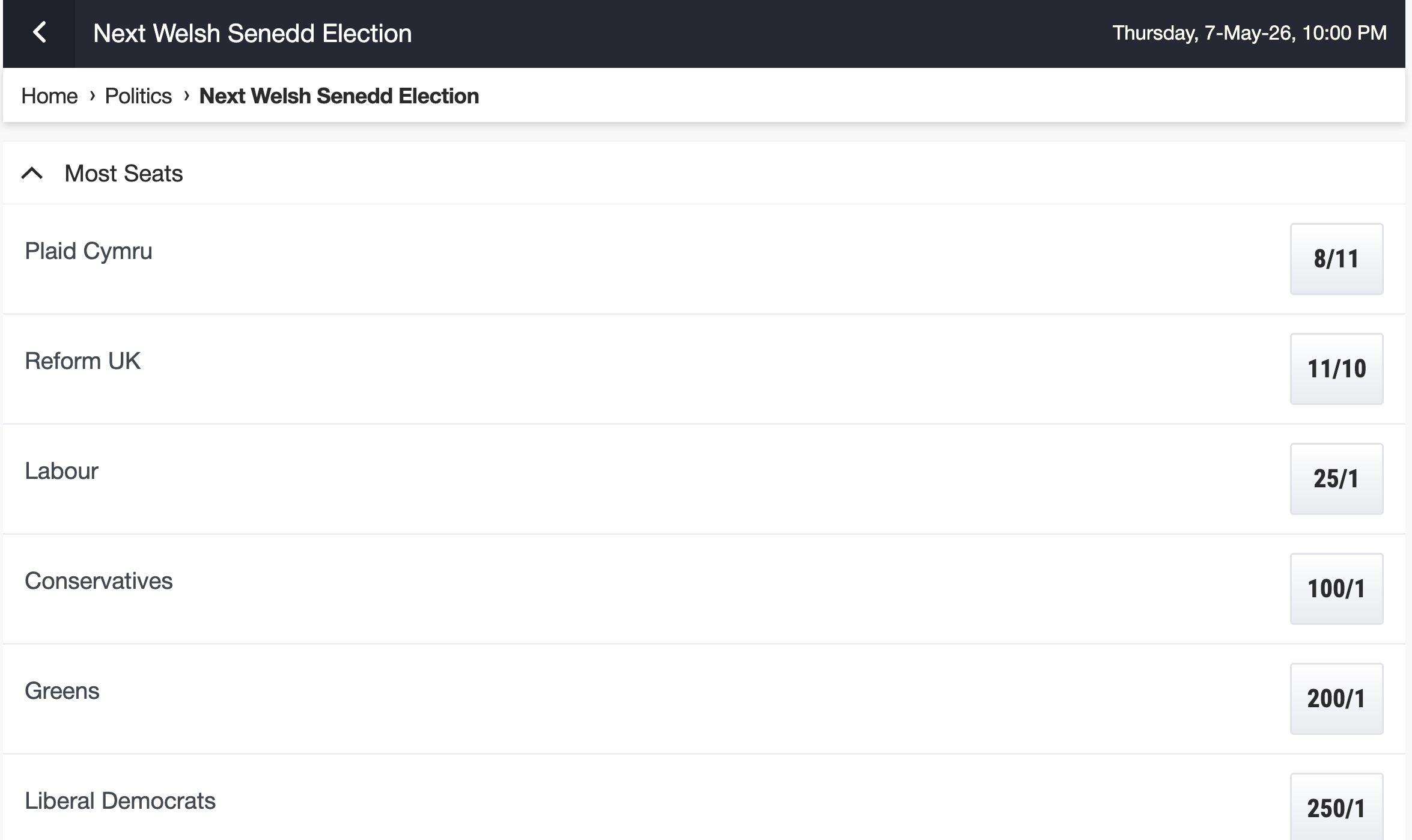 Rhun ap Iorwerth, leader of Plaid Cymru, is overseeing something special, he might end up saying in May ‘so I start a revolution from my Bedwellty’, looking at the markets from Ladbrokes there’s enough evidence for me to keep on backing Plaid Cymru in the most seats market which represents a 73% return in just under four months.