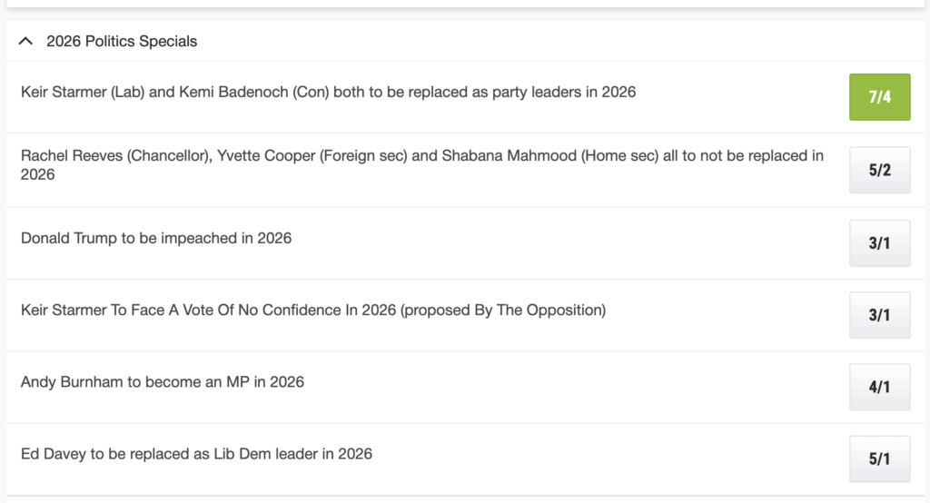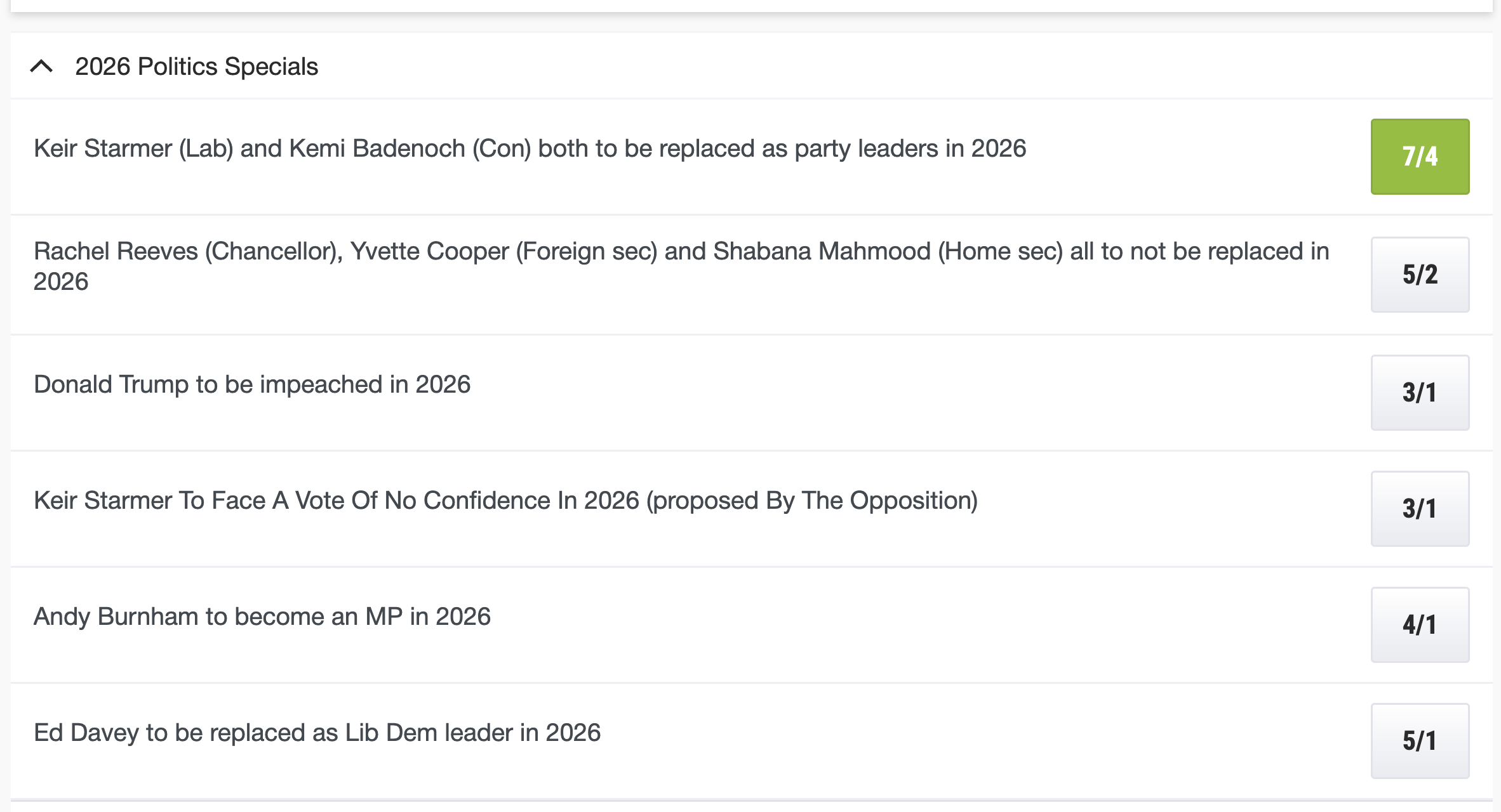 I think the value might be in the Starmer & Badenoch exit markets, these are the results that would normally end tenures of Prime Ministers and Leaders of the Opposition, for all her recent improvements the Badenoch’s Tories are still doing worse than the 2024 general election which will focus the minds of Tory MPs.