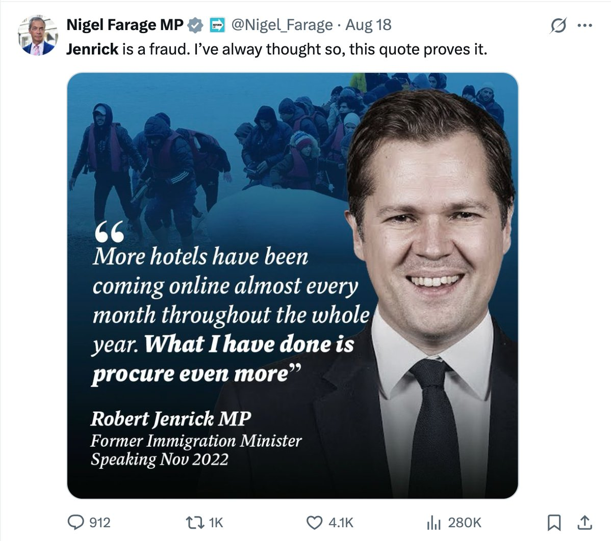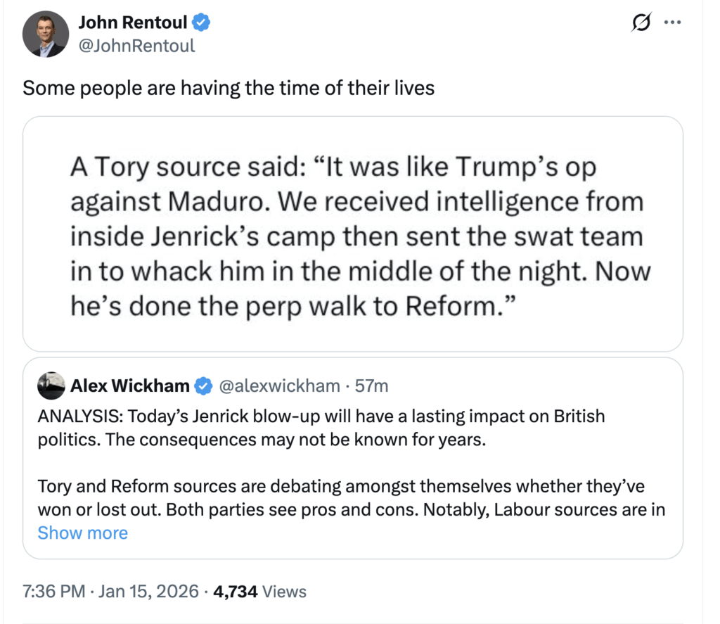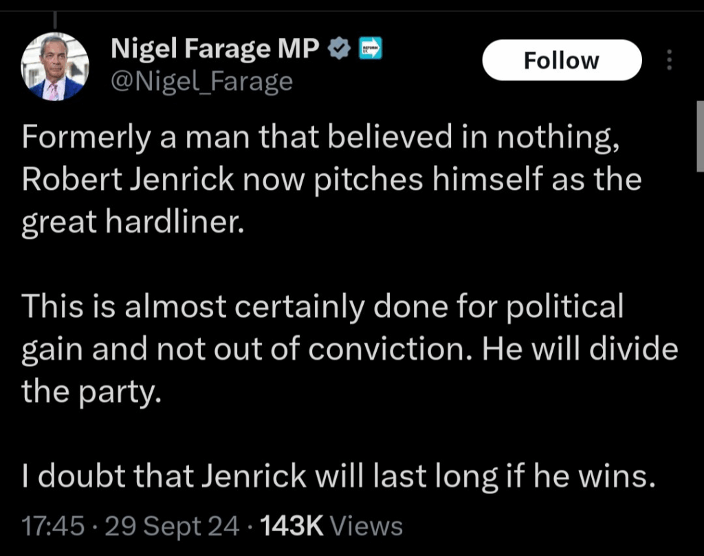 Given Nigel Farage’s inability to work well with other, for example 40% of Reform MPs elected at the 2024 general election are no longer Reform MPs, but there’s many more examples I could cite, but will Nigel Farage be able to cope with Robert Jenrick stealing the limelight.