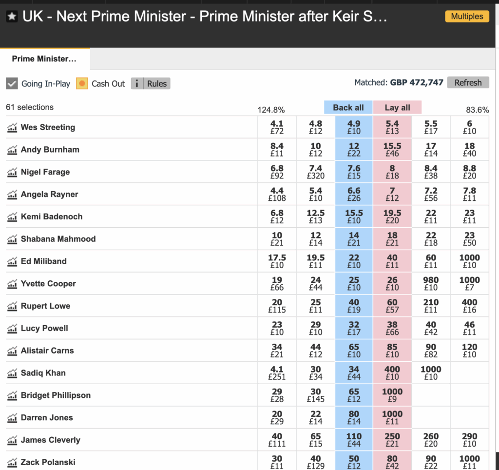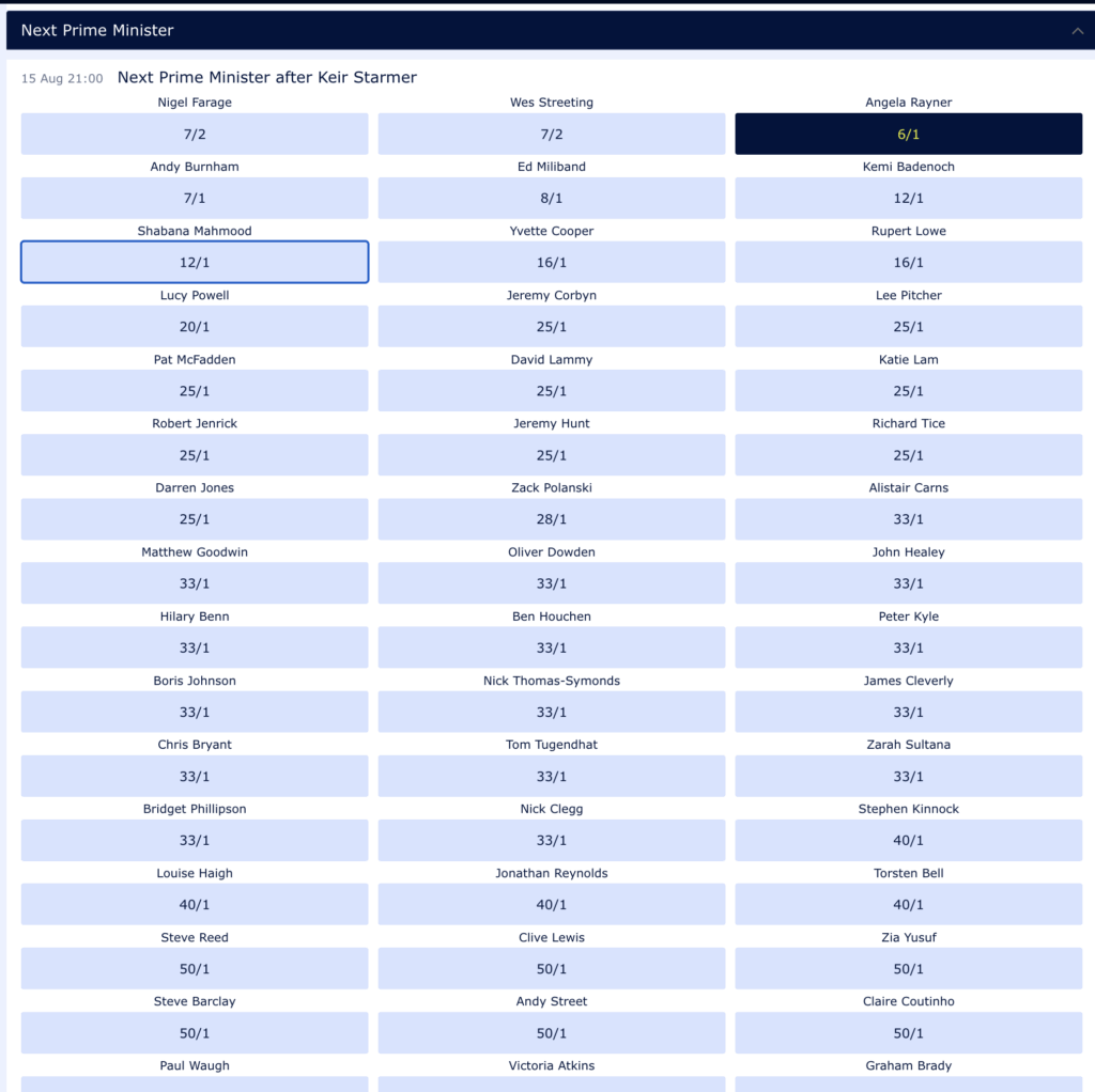 I have previously backed all three are decent odds but I still think there’s some value in backing Angela Rayner at 6/1 with William Hill and Shabana Mahmood at 14s on Betfair.