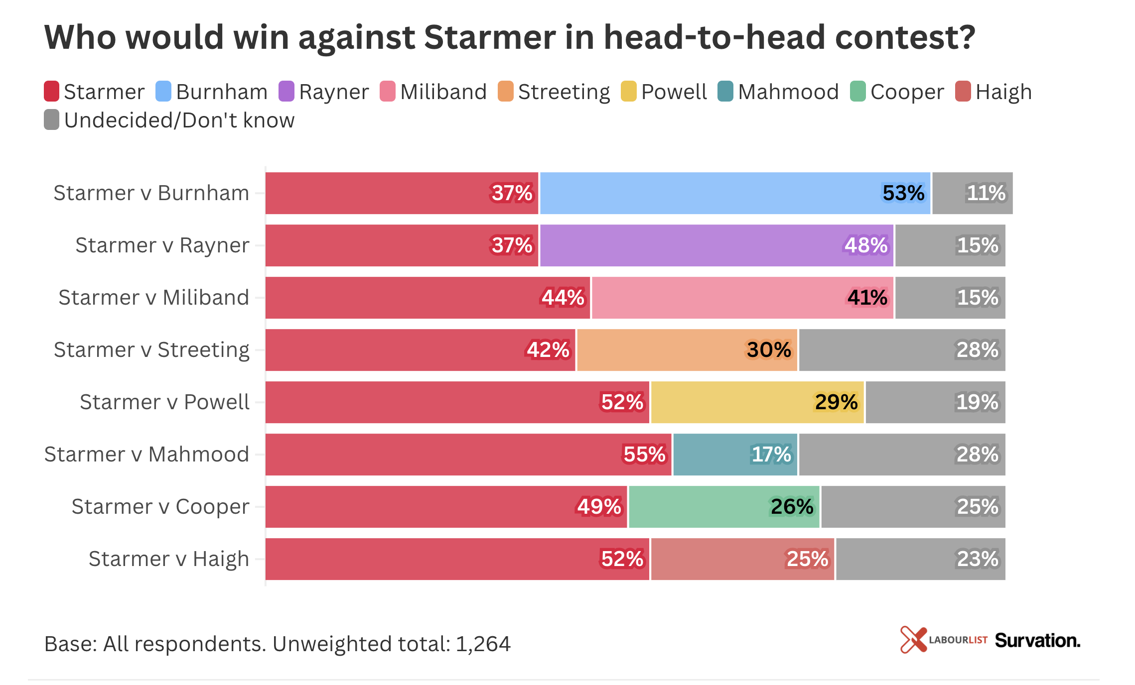 Polling conducted by Survation for LabourList found that the former deputy leader would defeat Starmer by a 11-point margin, but the Prime Minister would defeat the Energy Secretary by three points.